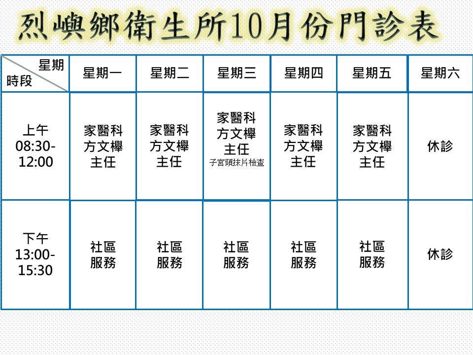 備註: 中秋節連假(10/4-10/6)、國慶日連假(10/10-10/12)、光復節連假(10/24-10/26)本所均休診。